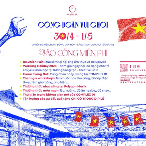 Series of Cultural – Creative – Recreational Events and Activities from April 30 to May 4 at COMPLEX 01 In celebration of Reunification Day (April 30) and International Workers’ Day (May 1), there’s no need to travel far—come to COMPLEX 01, a creative cultural space in the heart of Hanoi, and join a variety of …