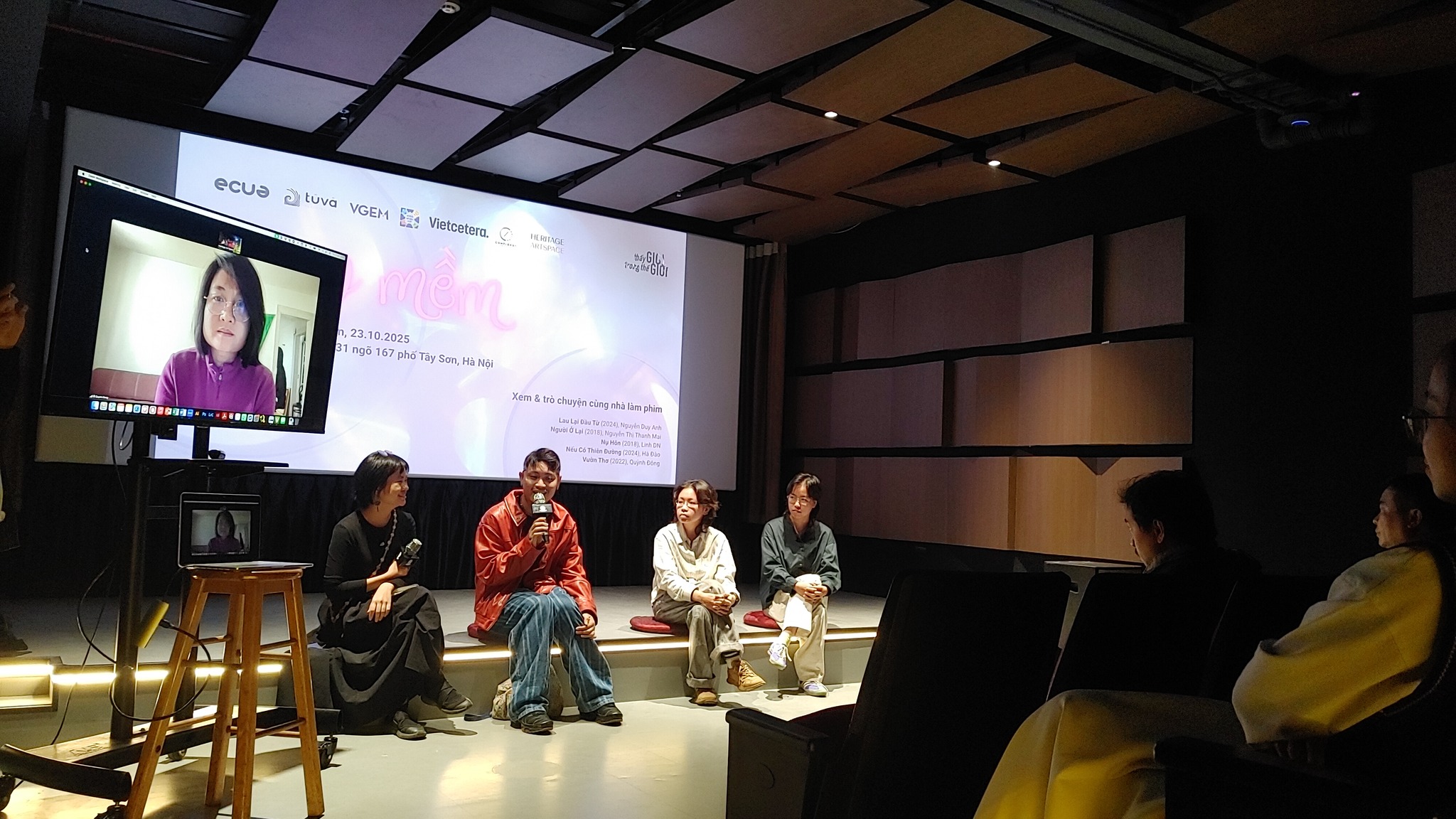 On the evening of October 23 at White Light Cinéhub, Heritage Art Space coordinated a film screening and conversation program. Five works were screened: “Wiping the Beginning” (Nguyen Duy Anh, 2024), “The One Who Stays” (Nguyen Thi Thanh Mai, 2018), “The Kiss” (Linh DN, 2018), “If There Is Heaven” (Ha Dao, 2024), and “Poetry Garden” (Quynh Dong, 2022).